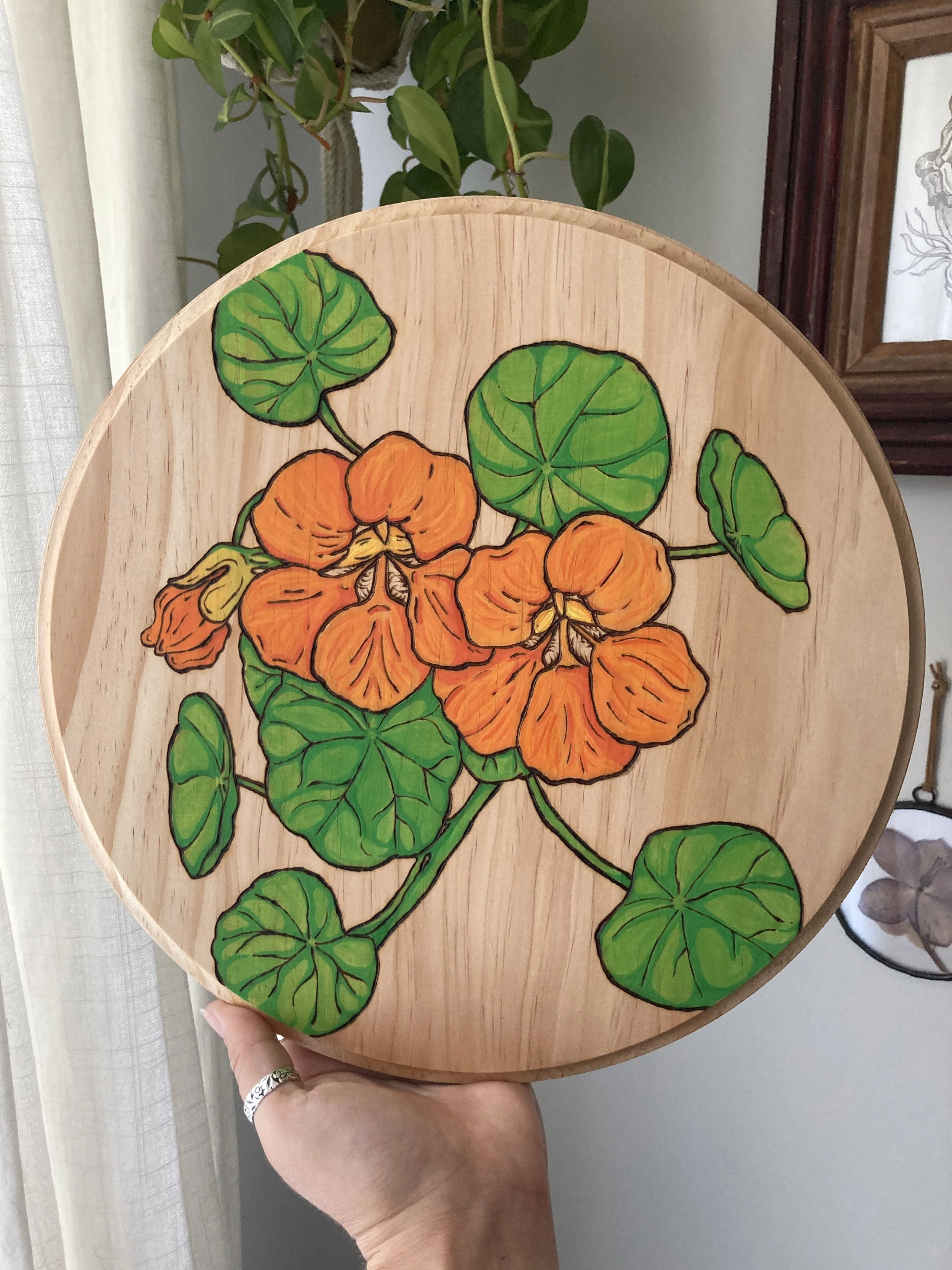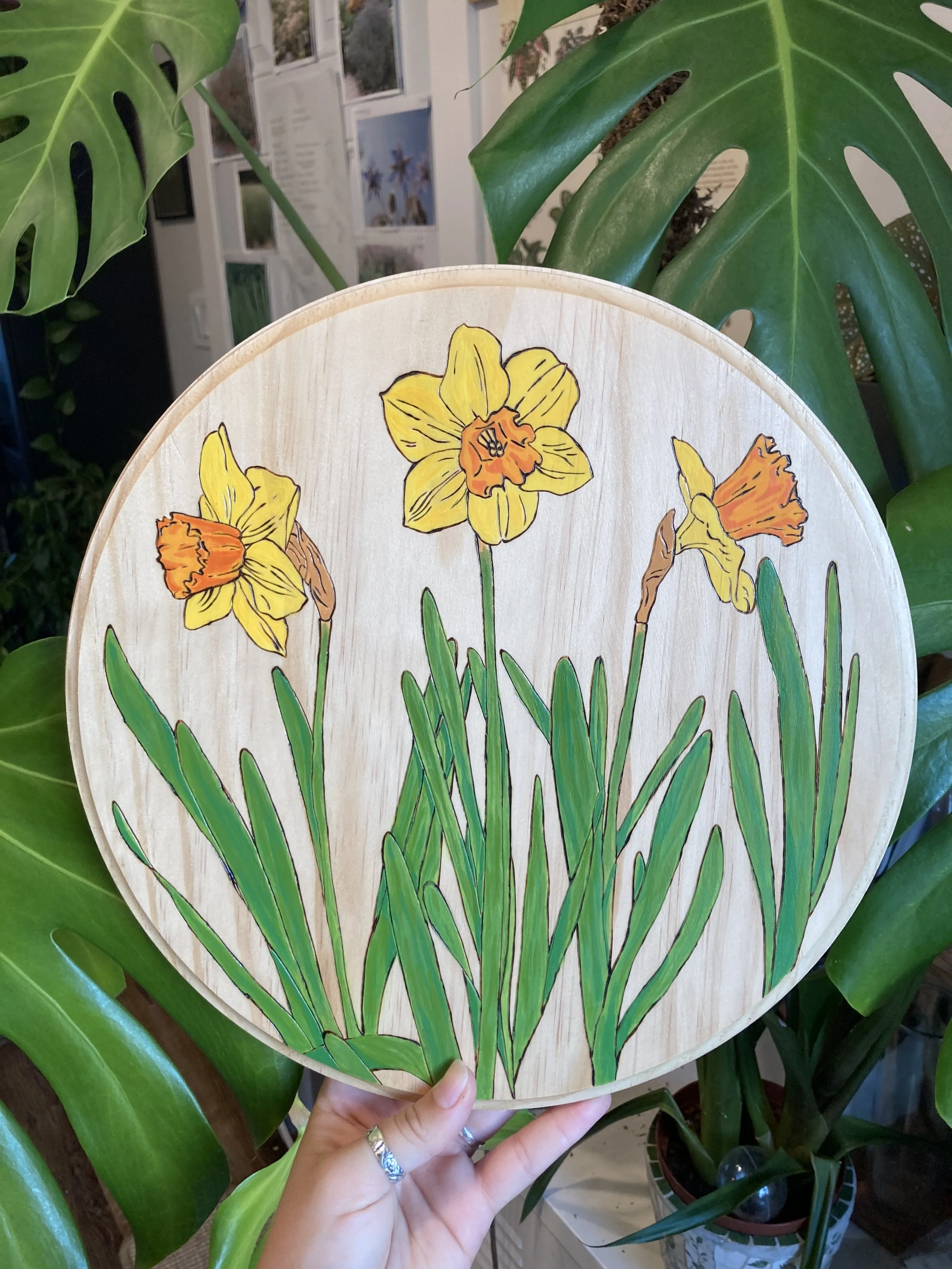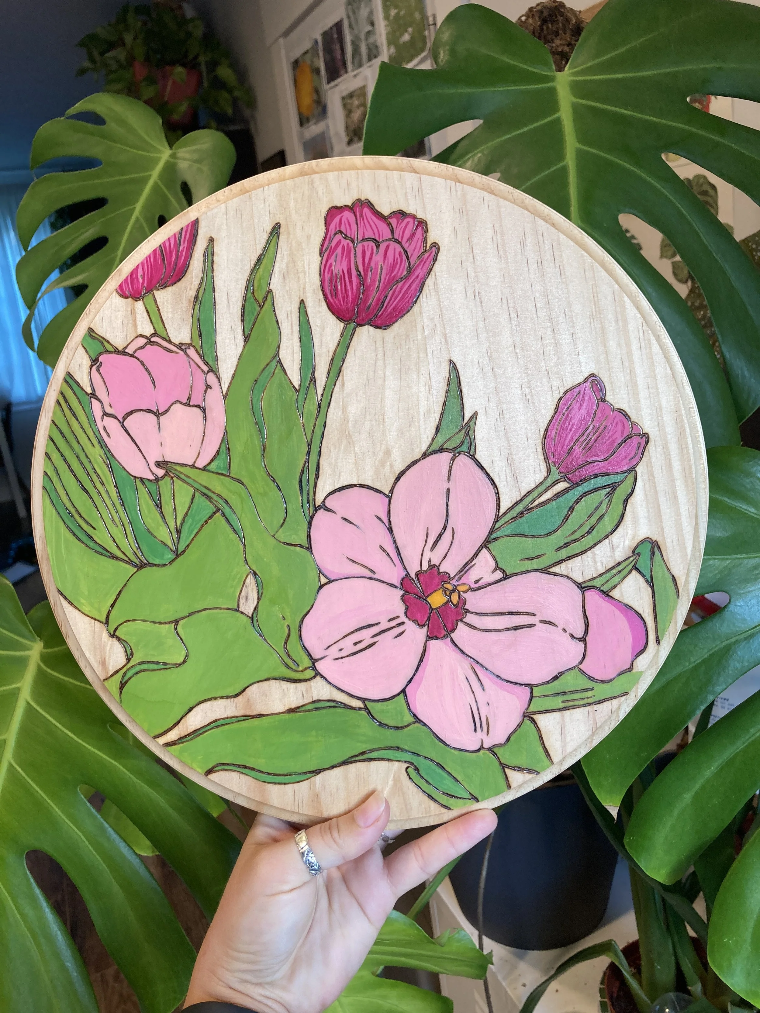 Wood Burning is one of the most satisfying mediums for Olive. The process starts with drawing the design, typically this is done digitally but Olive will also draw straight on to the wood as well. For digital designs, it then needs to be transferred to the wood using a graphic transfer method. The design is then hand burned using an electric wood burning tool.