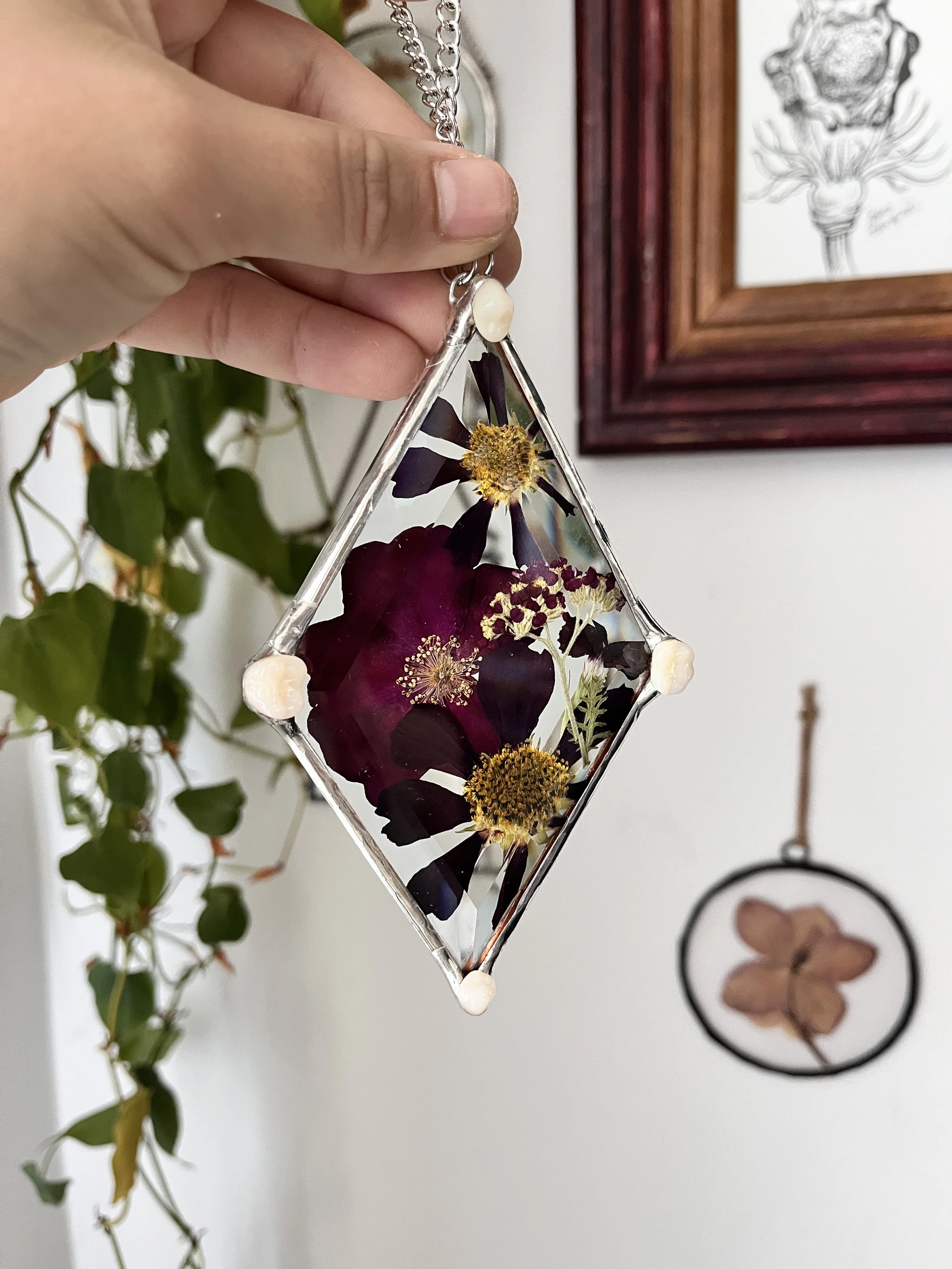 Homegrown botanicals encased in beveled glass and hand soldered (lead-free). 3x5 inch diamond.